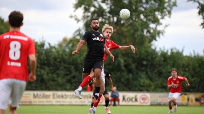 Kopfballduell zwischen Serhat Yazgan (FC Kilia Kiel) und Norman Owen Giebler (SV Eichede). Foto: Lobeca/Lienstädt